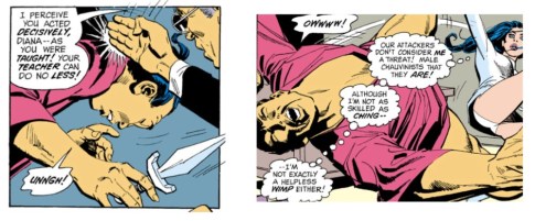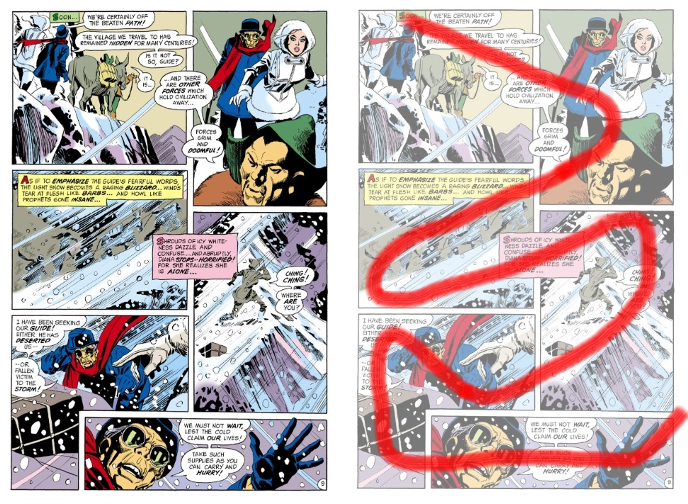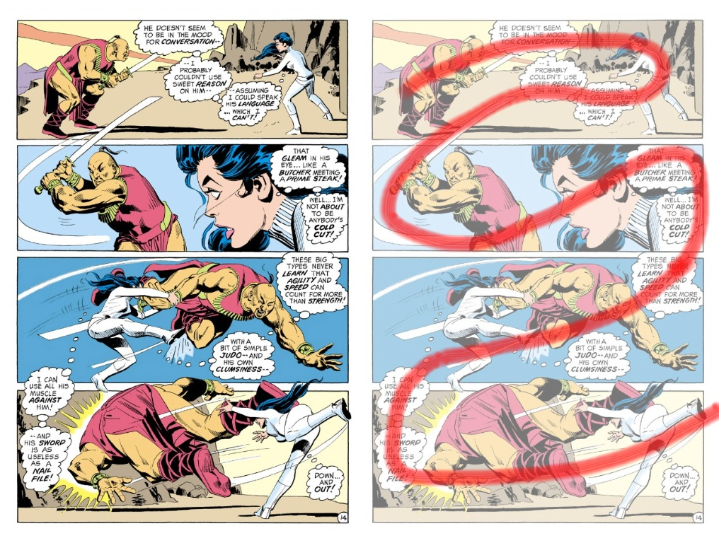 In Panel 3, the downward slope of Diana’s right leg leads you to her kicking action in Panel 4, where Giordano helpfully has her kicking leg stabbing up into the previous panel so your eye can more easily pick it up. Following along from here, you read down and left along the kicking leg, over to her thought balloons placed across the poor guy she just clobbered, then along his outstretched arm back to the right-hand side of the panel to the next page. This is what we call, “Pure Design Brilliance” or sometimes, “Come On, How Are We Supposed to Live Up to That?” here at Letter Better. In guided view, this effect is entirely destroyed: the next important thing to see after Panel 3, according to the GV Bot, is the left-most part of Panel 4, meaning just her word balloons, none of her kicking leg, and none of the thug’s outstretched arm.
