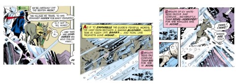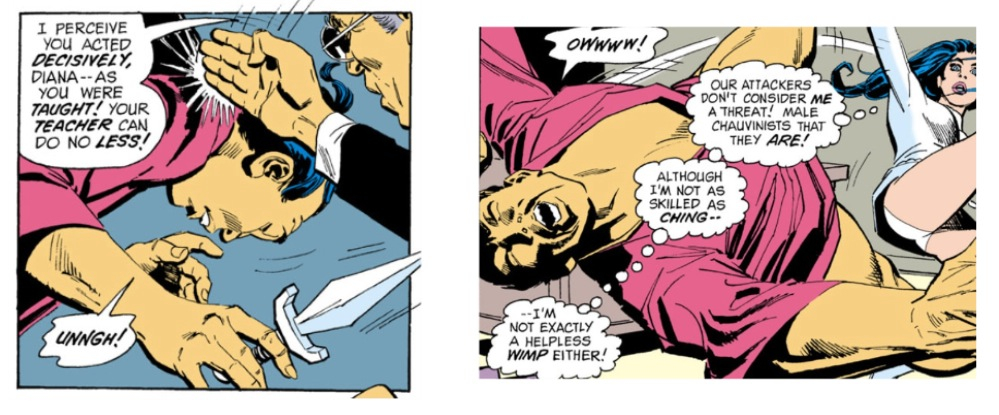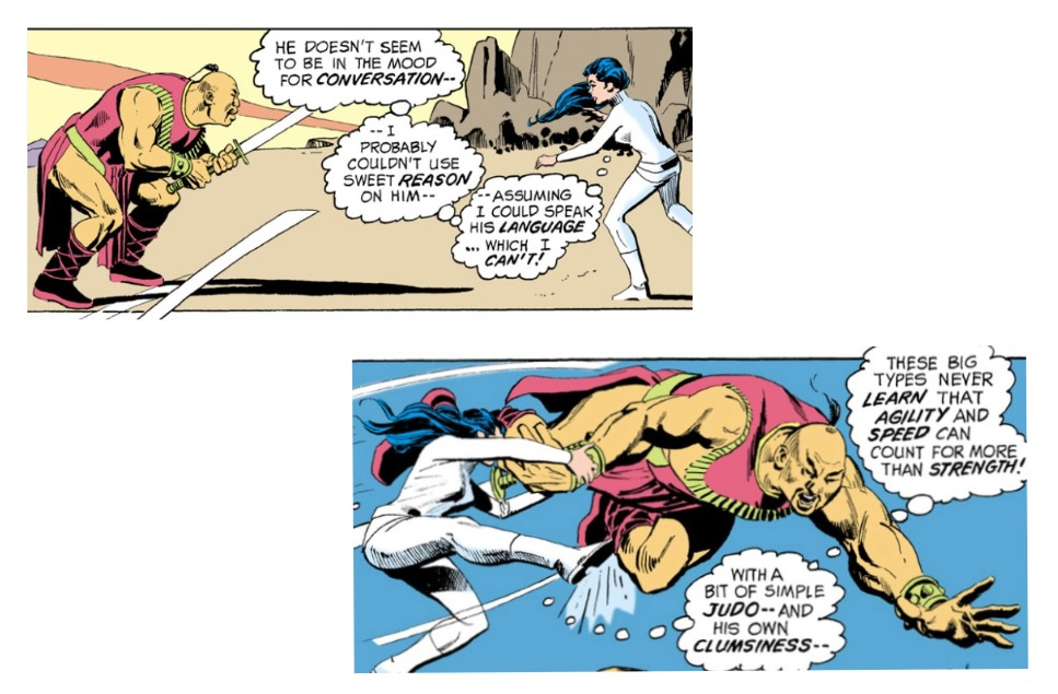 But don’t take my word for it, take the word of Wonder Woman #201, recently reprinted in DC’s Retroactive series this summer. If you can look past WW’s hip-hugging ’70s action suit and her battle with Tibetan samurai warriors plus Catwoman while suspended over a fiery death trap for just a moment and take a look at the underlying craft with me, you’ll notice that artist Dick Giordano and letterer John Constanza seem to have momentarily occupied the same brain while laying out these pages. With the efficency of the comics art master he was, Giordano carefully ensures that art within each panel leads the reader to the next one, the angles of limbs and buildings, mountain passes and flames all leaning towards the next action in the kind of swooping internal guided view that subconsciously trained a generation of artists in the unique visual language of comics. Costanza, making me sob jealously, follows Giordano’s lead, keeping his balloons and connecting tails in almost perfect lockstep with those angles while still managing to stay out of the way.