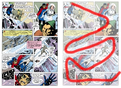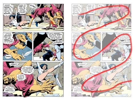 When part of the full page, the assailant’s dagger in Panel 2 points right to where your eye should go next in Panel 3: up the line of Diana’s leg to Costanza’s next balloon. In guided view, the dagger’s point is chopped off and you have no idea that there’s something immediately next to it that should be seen right away.